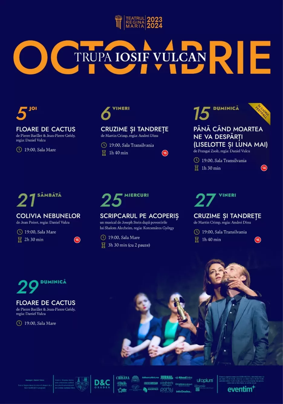 Printre piesele de teatru care vor fi jucate în luna octombrie se numără: Floare de cactus, Până când moartea ne va despărți și Scripcarul de pe acoperiș.
