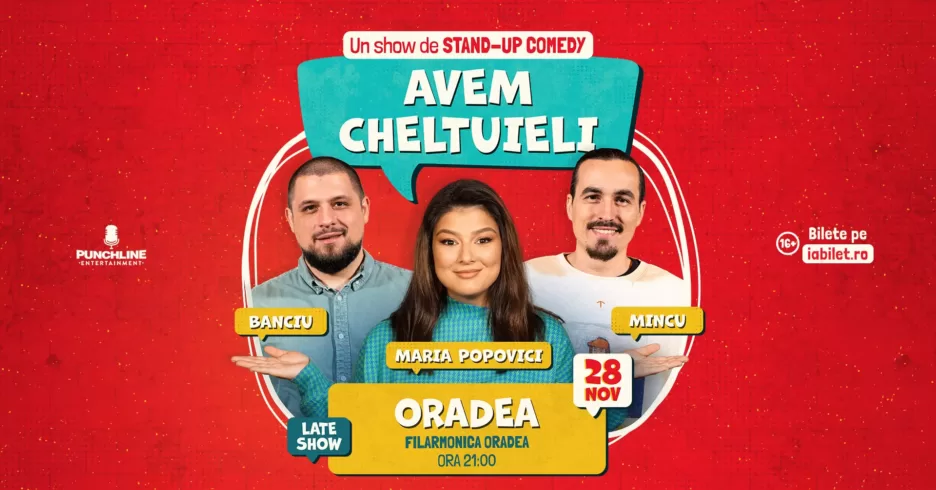 Spectacol de Stand-Up Comedy la Filarmonica Oradea, împreună cu Maria Popovici, Mincu și Banciu. Marți, 28 noiembrie, late-night show de la ora 21:00.