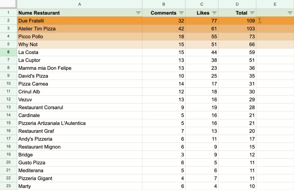 Vezi mai jos clasamentul final al chestionarului. Ține cont că toate aceste restaurante sunt din lista de favorite, prin urmare toate sunt câștigătoare pentru simplul fapt că au intrat în listă.