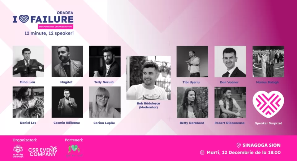 Pentru prima oară, evenimentul „I Love Failure Hope” ajunge la Oradea pe data de 12 decembrie. Evenimentul promite să ofere o experiență unică de aproximativ 4 ore, unde participanții vor avea ocazia să asculte 12 speakeri de renume din diverse domenii, inclusiv antreprenoriat, medicină, teatru, sport și psihologie.