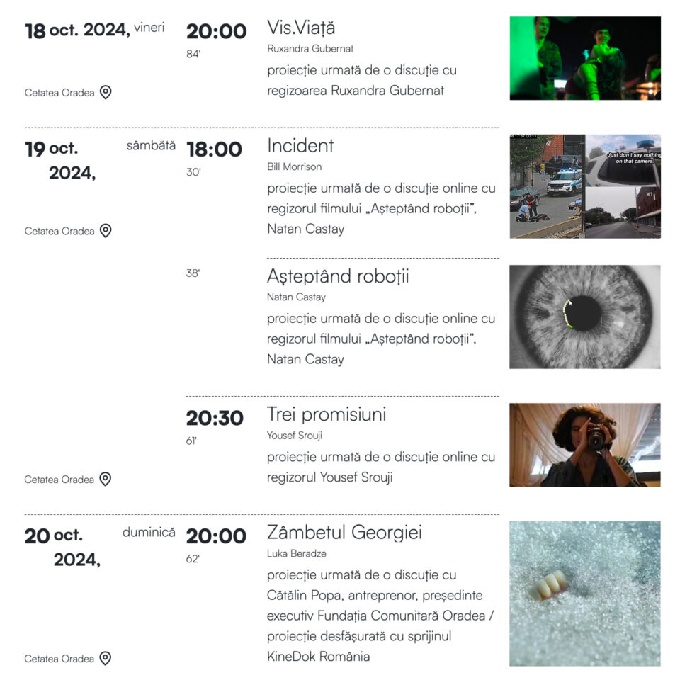 - Discuție: Proiecție urmată de o discuție cu Cătălin Popa, antreprenor și președinte executiv al Fundației Comunitare Oradea, susținută cu sprijinul KineDok România