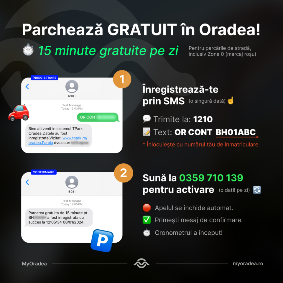 - Poți folosi o singură dată pe zi gratuitatea de parcare pentru 15 minute.