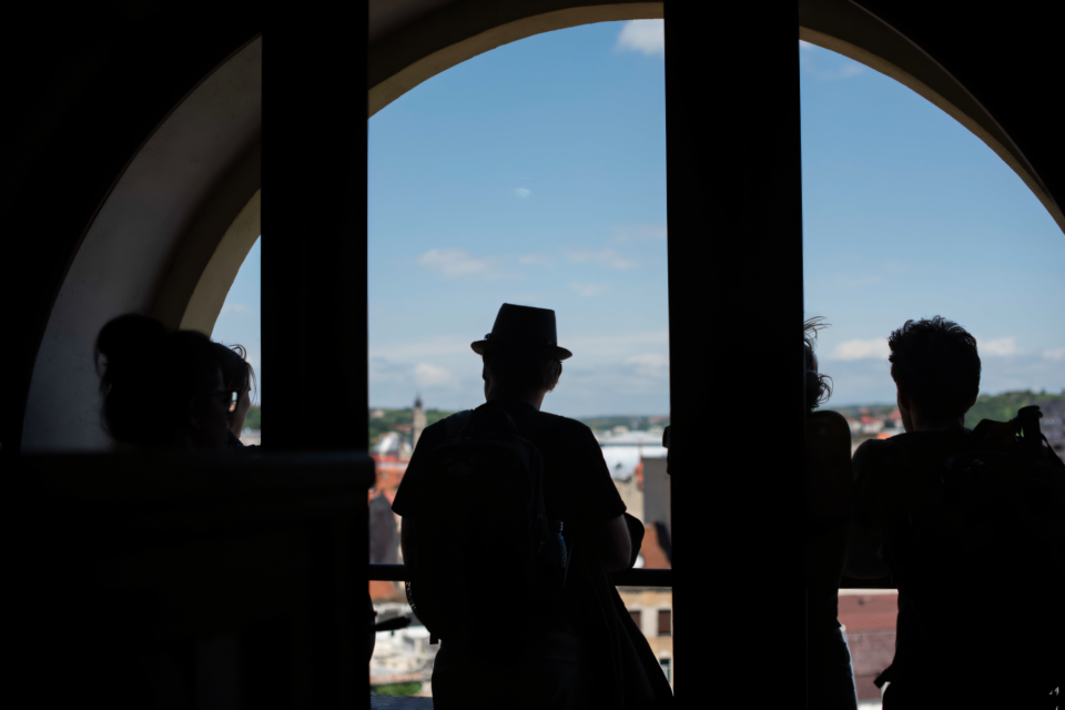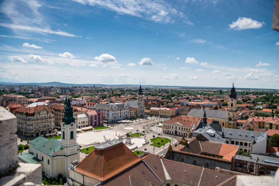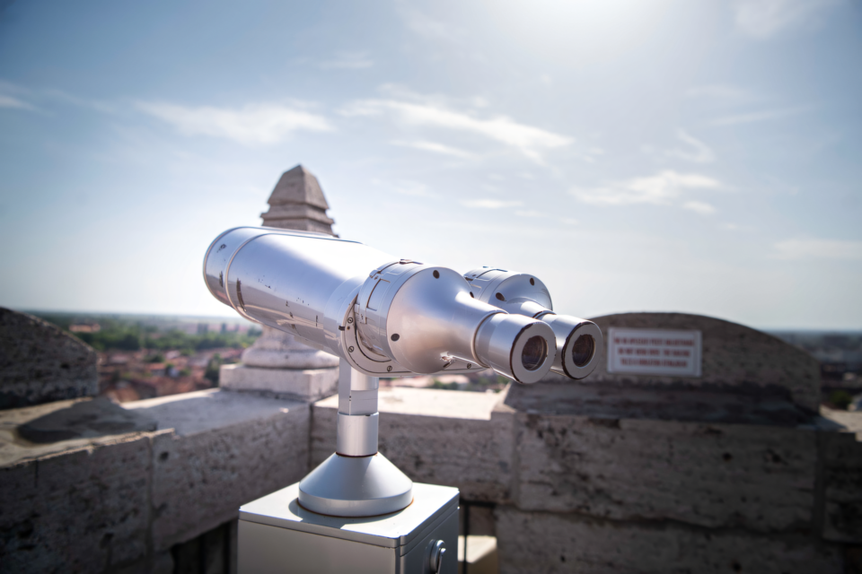 4. Pe ultimul nivel, poți folosi binoclul panoramic pentru a vedea Piața Unirii, clădirile din jur și restul orașului Oradea